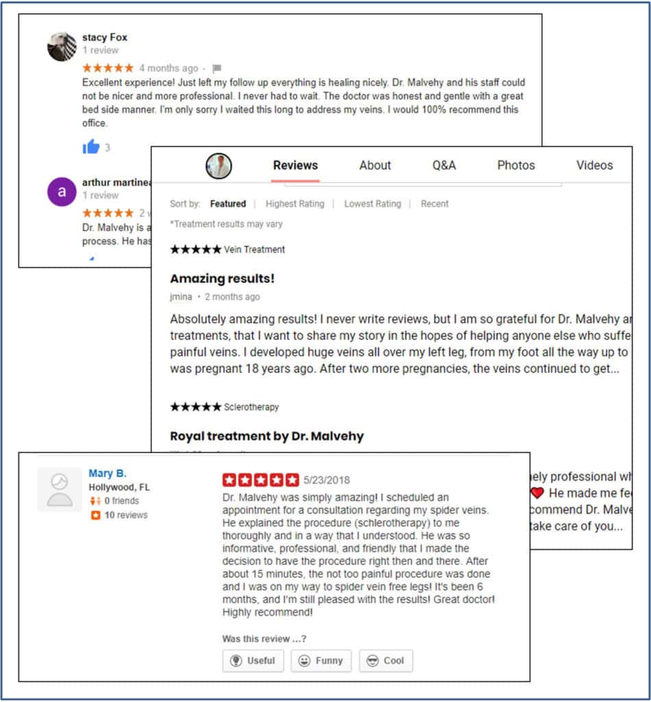 He has hundreds of 5-star ratings on Google, Healthgrades, Yelp!, and other platforms. A nationally recognized vein expert, Dr. Malvehy has appeared on ABC’s “The Doctors” as well as other national and local television programs.